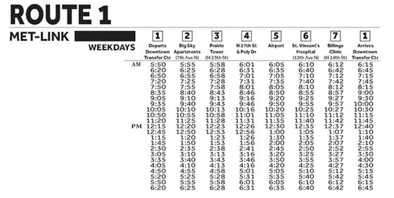 This service will provide convenient and affordable service to the hospital corridor and downtown Billings. Pick-up and Drop-off will be located at revolving Door #1 at the Airport Terminal Building. Once you reach the Downtown Transfer Center, you can transfer free of charge between buses to get to your final destination.